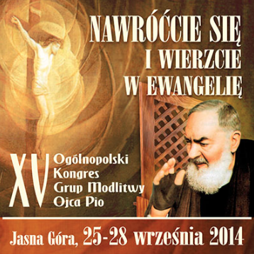 15. Ogólnopolski Kongres Grup Modlitwy Ojca Pio odbędzie się w dniach 25-28 września 2014 roku na Jasnej Górze w Częstochowie pod hasłem „Nawróćcie się i wierzcie w Ewangelię” i wprowadzi nas w kolejny rok pracy oparty na aktualnym, czteroletnim programie duszpasterskim Kościoła w Polsce „Przez wiarę i chrzest do świadectwa”.