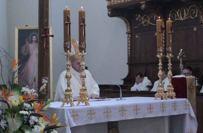 O godz. 11.00 rozpoczęła się uroczysta Eucharystia której przewodniczył i homilię wygłosił J.E. Ks. Biskup Edward Frankowski, sufragan sandomierski. W swoim słowie skierowanym do wiernych Biskup powiedział między innymi: „… od pięciu lat gromadzimy się w świętokrzyskim sanktuarium, w dniu, w którym 55 lat temu (27 kwietnia 1956 roku) Sejm PRL uchwalił zbrodniczą ustawę, pozwalającą mordować niewinne istoty ludzkie. Jesteśmy tu obecni, aby Bogu wynagradzać naszą modlitwą ten straszny grzech mordu ponad 20 milionów istnień ludzkich. To grzech, który spowodował, że jest mniej dzieci, zamyka się szkoły, nie ma, kto pracować na emerytury tych, którzy pracować nie mogą. Chrystus pragnie, byśmy byli obrońcami życia i miłości, która rodzi życie. Jako katolicy, chrześcijanie nie możemy za euro – srebrniki zaprzedawać wartości, które stoją w obronie moralności i życia" – mówił kaznodzieja. Wspomniał także osobę papieża Jana Pawła II, wielkiego promotora i obrońcę życia, cywilizacji miłości i życia ludzkiego od poczęcia do naturalnej śmierci: „Dziś nasz ukochany papież Jan Paweł II wstawia się za nami i wspiera nas w tej walce. Módlmy się za rządzących, za parlamentarzystów i dziennikarzy, by dobry Bóg dał im światły umysł i serce, by nigdy nie krzywdzili żadnego człowieka i głosili prawdę".