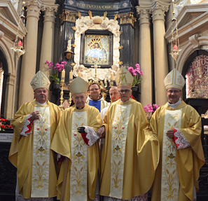 Dziękując razem z Wami za 65 lat uczestnictwa w Chrystusowym Kapłaństwie, a przez święcenia biskupie w jego pełni, całujemy z szacunkiem i miłością Wasze ojcowskie dłonie, a nasze dla Was życzenia pragniemy wyrazić słowami, które dokładnie w tym samym miejscu, gdzie dziś razem otaczamy ołtarz, wypowiedział osobiście Św. Jan Paweł II w dniu 19.08.2002 r., gdy po raz drugi nawiedził Sanktuarium Kalwaryjskie w Jubileuszowym roku 400-lecia jej powstania. Całym sercem prosimy Matkę Najświętszą, Panią Kalwaryjską, by upraszała Wam siły ciała i ducha, abyście do końca wypełnili misję, którą zlecił Wam Zmartwychwstały Chrystus!