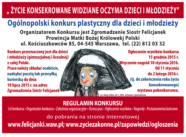 Portal internetowy www.zyciezakonne.pl jest współpatronem ogólnopolskiego konkursu plastycznego „Życie konsekrowane widziane oczyma dzieci i młodzieży” zorganizowanego przez Zgromadzenie Sióstr Felicjanek (Prowincja Matki Bożej Królowej Polski – Warszawa) w związku z rozpoczętym Rokiem Życia Konsekrowanego.