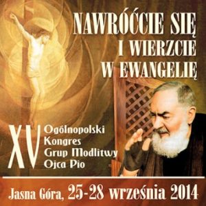 15. Ogólnopolski Kongres Grup Modlitwy Ojca Pio odbędzie się w dniach 25-28 września 2014 roku na Jasnej Górze w Częstochowie pod hasłem „Nawróćcie się i wierzcie w Ewangelię” i wprowadzi nas w kolejny rok pracy oparty na aktualnym, czteroletnim programie duszpasterskim Kościoła w Polsce „Przez wiarę i chrzest do świadectwa”.