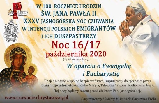 Jasnogórska Noc Czuwania w intencji Polonii i jej duszpasterzy odbędzie się w tym roku z 16/17 października. W dobie pandemii zapraszamy do duchowej łączności przez TV Trwam, Radio Maryja i transmisję internetową. Spotkanie odbywa się w 100. rocznicę urodzin św. Jana Pawła II pod hasłem: „W oparciu o Ewangelię i Eucharystię”.