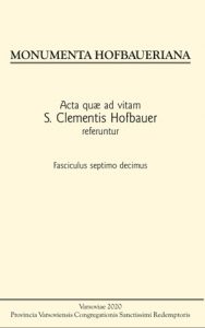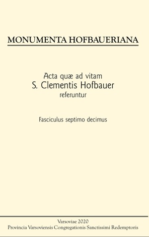 Jedną z inicjatyw podjętych przez Prowincję Warszawską Redemptorystów z okazji jubileuszu 200-lecia śmierci św. Klemensa jest publikacja kolejnego – siedemnastego już – tomu serii wydawniczej Monumenta Hofbaueriana, w której zamieszczane są dokumenty dotyczące jego życia i działalności. Tom, który oddajemy do rąk Czytelników,  zawiera odnalezione w ostatnim czasie w archiwach polskich, francuskich i niemieckich nie znane nam dotychczas dokumenty odnoszące się do usunięcia redemptorystów z Warszawy w 1808 roku.
