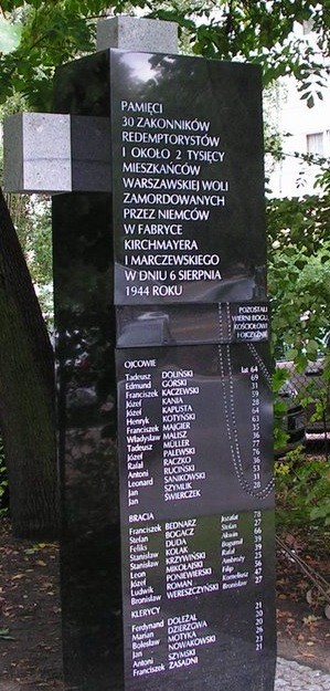 Tragiczne wydarzenie sprzed 69 lat zostało upamiętnione 3 lata temu pomnikiem, który stanął w miejscu egzekucji, naprzeciw kościoła św. Wojciecha. Pomnik ma wysokości 2,5 metra i wyobraża habit zakonny (czarny granit) wtopiony w biały krzyż. Na pomniku umieszczono napis: „Pamięci 30 zakonników redemptorystów i około 2 tysięcy mieszkańców Woli zamordowanych przez Niemców w fabryce Kirchmayera i Marczewskiego w dniu 6 sierpnia 1944 roku. Pozostali wierni Bogu, Kościołowi i Ojczyźnie”. Dalej następują nazwiska zamordowanych zakonników. Pomnik zaprojektował Marek Moderau.