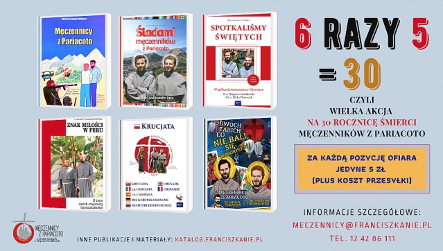 W roku jubileuszowym 30 lat od śmierci Męczenników z Pariacoto szczególnie zapraszamy Was do poznawania ich życia, a także stawania się małymi apostołami ich dzieła w swoich środowiskach życia i pracy. Aby było to łatwiejsze przygotowaliśmy dla was książkowo-filmową ofertę, którą nazwaliśmy roboczo 6×5=30 (sześć pozycji książkowych ofiara po 5.00 zł z okazji 30 rocznicy męczeńskiej śmierci). Wśród sześciu polecanych publikacji znajduje się także album oraz film pt. „Krucjata”, który odpowiada o Krucjacie Różańcowej w Obronie przed Terroryzmem, jaka przed 5 laty powstała pod patronatem błogosławionych franciszkanów.