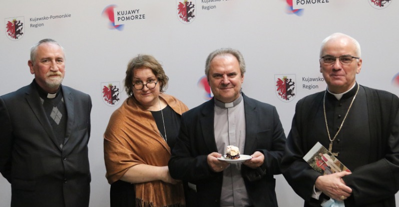 Na zdjęciu powyżej stoją od lewej: o. Wojciech Żmudziński SJ (socjusz Prowincjała PMA), p. Katarzyna Cesarz (kustosz muzeum kard. Adama Kozłowieckiego) o. Lesław Ptak SJ (superior wspólnoty jezuitów w Toruniu) oraz ks. biskup Józef Szamocki. Na zdjęciu poniżej prelegenci. Od lewej: dr hab. Michał Białkowski, ks. Jarosław Czyżewski, dr Katarzyna Mich, dk. prof. Waldemar Rozynkowski, o. prof. Stanisław Cieślak SJ, o. dr Krzysztof Dorosz SJ, o. dr Grzegorz Dobroczyński SJ. Dołączył online także ks. prof. Jarosław Różański OMI.