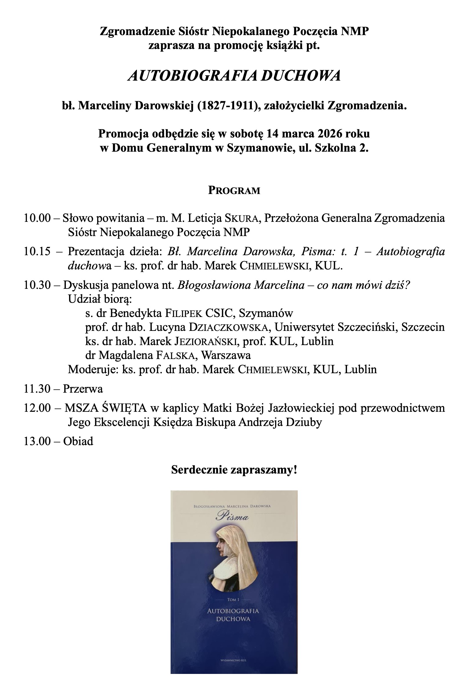 Na początku 2026 roku w Wydawnictwie KUL ukazał się pierwszy tom pism bł. Marceliny Darowskiej pt. *Autobiografia duchowa*, liczący 1015 stron. Zawiera on teksty o głębokiej treści duchowej i mistycznej, pozwalające lepiej zrozumieć fenomen założycielki niepokalanek. Tom otwiera niedokończona autobiografia pt. *Coś, co poprzedziło*. Następnie zamieszczono m.in. 28 notatek wyjętych z listów do jej kierownika duchowego, o. Hieronim Kajsiewicz, dwuczęściowy *Pamiętnik*, bieżące *Zapiski*, *Testament*, kilka krótkich pism z ostatnich dni życia, relacje sióstr z okresu jej śmiertelnej choroby oraz mowę pogrzebową wygłoszoną przez abp. Józef Teodorowicz, stanowiącą syntezę jej życia i dzieła.