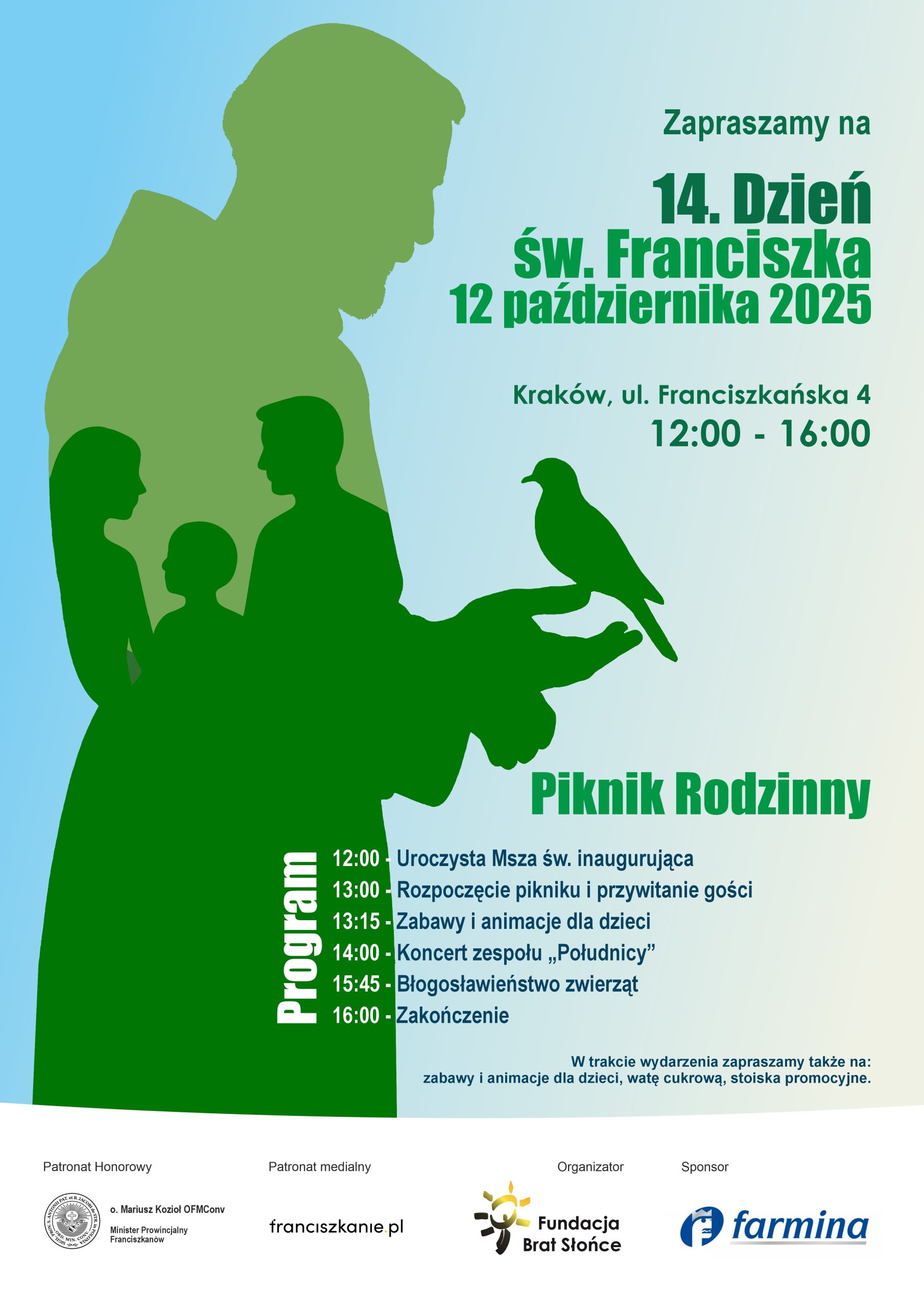 Obchody 14. Dnia św. Franciszka rozpoczną się jednak zdecydowanie wcześniej. O godz. 12.00 w bazylice franciszkanów celebrowana będzie msza św., a po niej na zewnątrz świątyni zaplanowano piknik rodzinny. W jego programie znajdą się m.in. zabawy i animacje dla dzieci oraz koncert zespołu „Południcy” – informuje Anna Bielak, dyrektor zarządzający Fundacją.