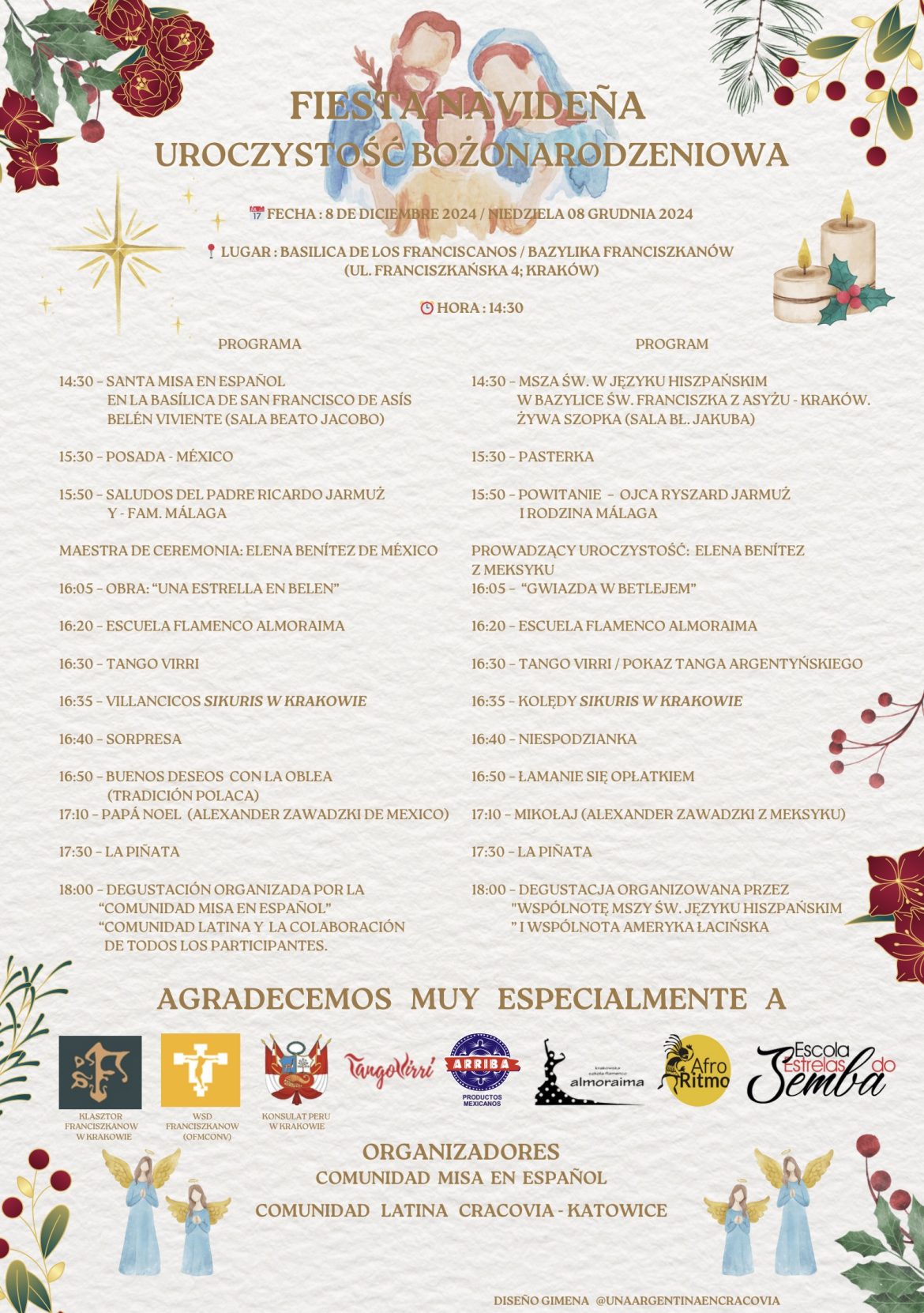 Jak mówi nam o. Ryszard Jarmuż, wieloletni misjonarz w Boliwii, Meksyku, Paragwaju i Peru, a obecnie duszpasterz Latynosów w Krakowie, w programie znajdą się ponadto: przedstawienie o Gwieździe Betlejemskiej, kolędy i tańce latynoskie, łamanie się opłatkiem, św. Mikołaj oraz la piñata (rozbijanie kuli z siedmioma kolcami symbolizującymi grzechy główne, z której w nagrodę wysypują się słodycze).