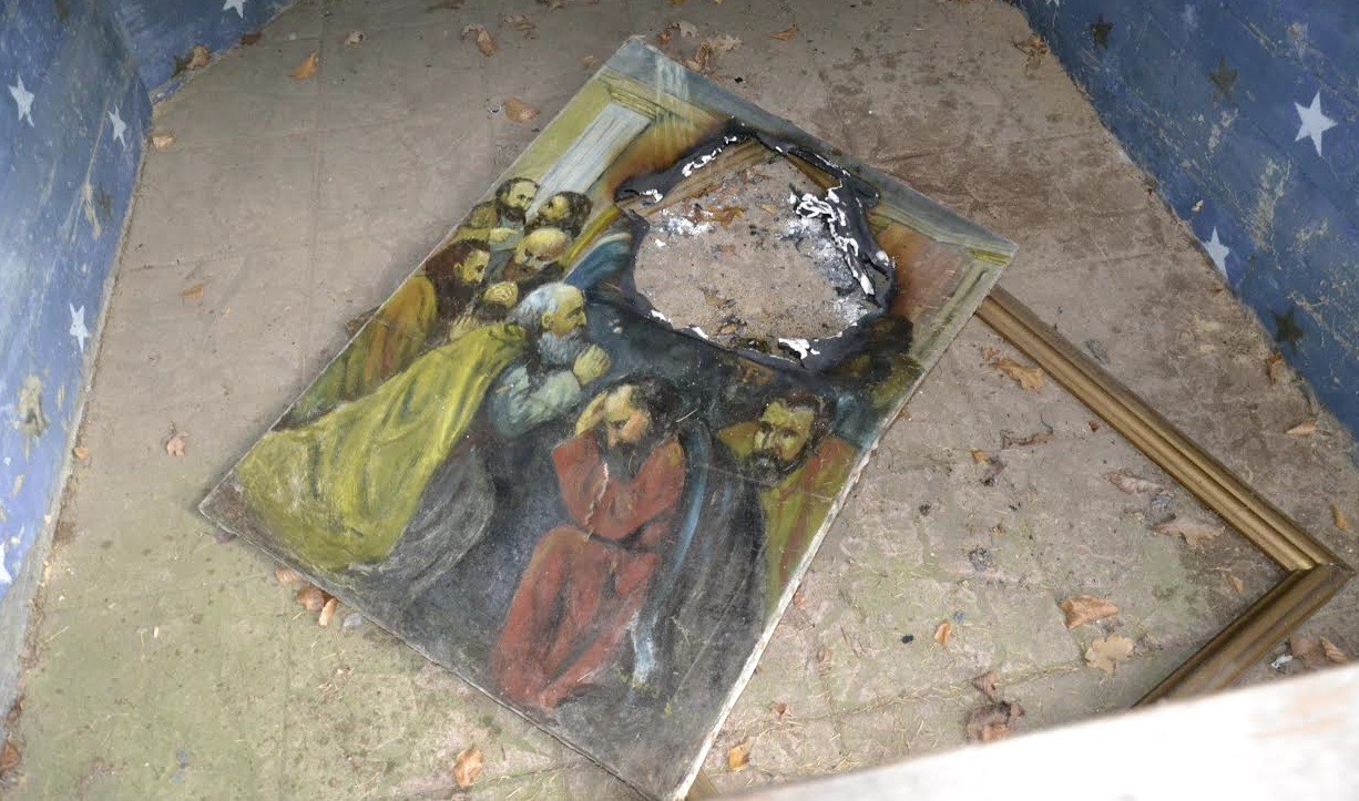 W drugiej kaplicy wyrwano ze ściany obraz, a płótno wyjęto z ram i porzucono. Obraz przedstawiał pożegnanie Maryi z Apostołami.
