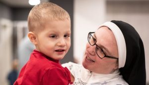S. Tymoteusza: Mikuś na przykład… Mikuś został odebrany rodzicom, bo urodził się z ponad promilem alkoholu we krwi. Jego mózg jest na stałe uszkodzony. Przyjechał do nas, kiedy miał siedemnaście miesięcy z opinią lekarzy, że ma nadwrażliwość skóry i najlepiej go nie przytulać i nie całować, bo sprawia mu to ból. Nie wiedziałyśmy, co robić. Postanowiłyśmy, że będziemy codziennie bardzo delikatnie brały go na ręce i zobaczymy, jak wygląda ta nadwrażliwość. I już po tygodniu Mikołaj wyciągnął ręce z łóżeczka, żeby go przytulać. Od tamtej pory to jest taka mała przytulanka, jak widzi biały habit, to od razu biegnie. Jego specjalną mamą jest Gracjana. Mikołaj ma minus 21 wady wzroku, czyli widzi jedną wielką plamę, a kiedy stoimy z siostrami, on podchodzi do Gracjany i wyciąga ręce właśnie do niej.