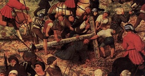 Szymon Cyrenejczyk pomaga nieść krzyż Jezusowi.