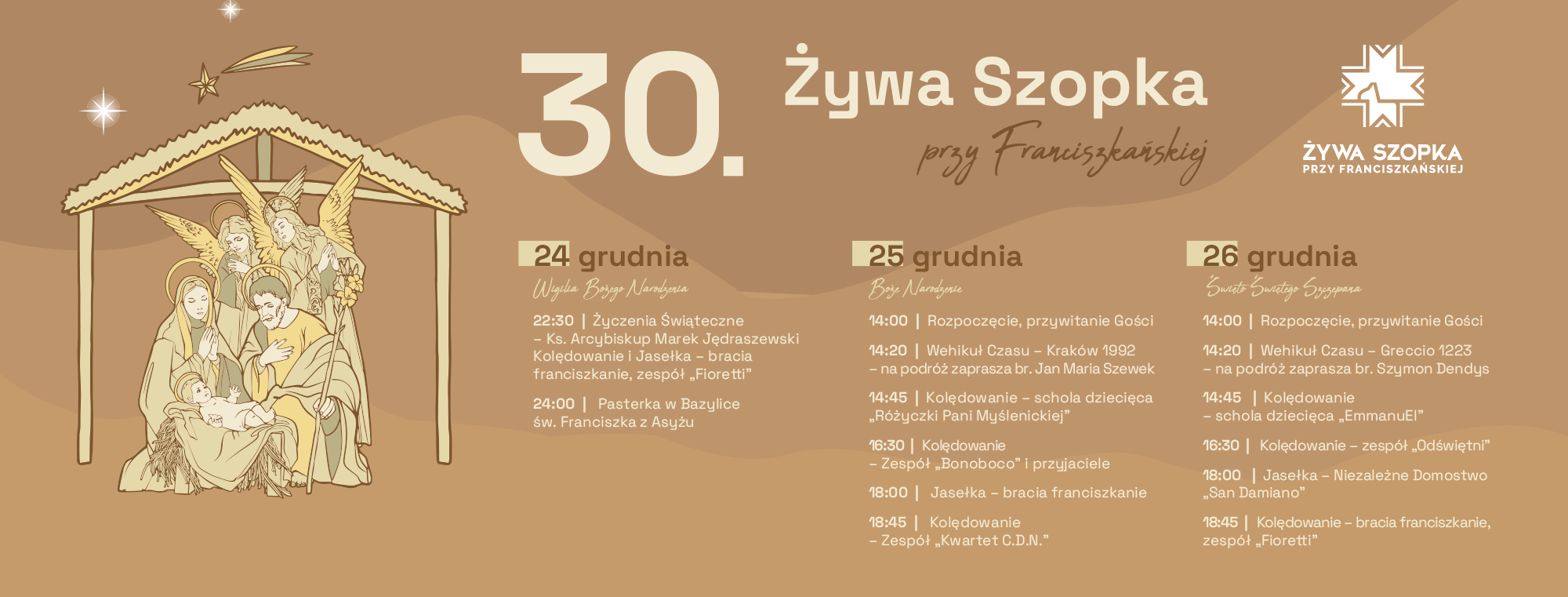W tym roku chcemy nawiązać do naszych korzeni. Trzy dekady istnienia Żywej Szopki to świetna do tego okazja. Możliwość zaznajomienia się z początkami tej tradycji i jej inspiracjami będzie dostępna dla każdego z przybyłych gości. Wraz z braćmi będzie można przenieść się wstecz „Wehikułem Czasu”. Taki tytuł noszą dwie prelekcje, które zostaną przedstawione podczas wydarzenia. Nawiążą zarówno do historii z Greccio, jak i do początków krakowskiej Żywej Szopki.