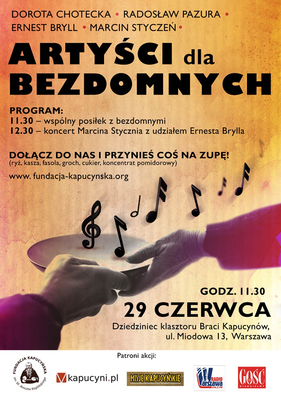 Talerz zupy od Doroty Choteckiej, Ernesta Brylla, Radosława Pazury, Przemysława Babiarza i innych znanych osób dostaną bezdomni podczas akcji „Artyści dla bezdomnych”, organizowanej przez Fundację Kapucyńską 29 czerwca 2013 r., o godz. 11:30.