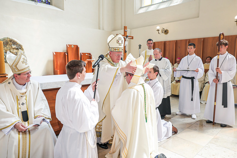 Po homilii kandydat na biskupa został publicznie zapytany o gotowość do podjęcia posługi pasterskiej – m.in. głoszenia Ewangelii, troski o lud Boży, wierności Kościołowi i następcy św. Piotra. Na każde z pytań odpowiedział: „Chcę”. Następnie, jako znak całkowitego zawierzenia Bogu, modlił się leżąc krzyżem na posadzce – w geście prostracji. W tym czasie zgromadzeni śpiewali Litanię do Wszystkich Świętych, wzywając wstawiennictwa nieba nad nowym pasterzem. Główny konsekrator, współkonsekratorzy oraz pozostali biskupi obecni na liturgii w milczeniu nałożyli ręce na głowę kandydata. Gest ten oznacza przekazanie daru Ducha Świętego i włączenie w sukcesję apostolską – nieprzerwany łańcuch święceń sięgający czasów Apostołów. Po nałożeniu rąk główny konsekrator odmówił uroczystą modlitwę święceń, prosząc Boga, by udzielił nowemu biskupowi darów Ducha Świętego, mądrości, roztropności i ducha pasterskiego. Nowo wyświęcony biskup został namaszczony krzyżmem – świętym olejem, który jest znakiem szczególnego udziału w kapłaństwie Chrystusa i w misji uświęcania Ludu Bożego. Otrzymał Ewangeliarz – księgę Słowa Bożego, która wcześniej była trzymana nad jego głową przez diakonów. To znak jego misji: głosić Ewangelię „w porę i nie w porę”. Otrzymał również insygnia biskupie: pierścień – wyrażający wierność i zaślubiny z Kościołem, Oblubienicą Chrystusa; mitrę – symbol biskupiej godności i wezwania do świętości; oraz pastorał – laskę pasterską, znak troski o powierzoną mu owczarnię. Na zakończenie obrzędu święceń nowy biskup otrzymał od współkonsekratorów znak pokoju – wyraz braterskiej więzi i włączenia do kolegium biskupów.