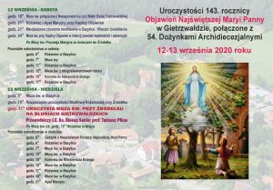 Uroczystości rozpoczną się w sobotę 12 września o godz. 18.00 Mszą św. połączoną z Nieszporami ku czci Matki Bożej Gietrzwałdzkiej. W programie jest też Apel Maryjny o godz. 21.00, po nim wieczór uwielbienia, a o północy Msza św. w intencji nowych powołań kapłańskich i zakonnych. Główna Eucharystia, pod przewodnictwem biskupa seniora Tadeusza Pikusa, na gietrzwałdzkich błoniach odbędzie się w niedzielę 13 września o godz. 11.00. Liturgię poprzedzi modlitwa różańcowa o godz. 10.00.