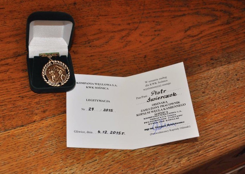 Wręczenie medalu miało miejsce w niedzielę, 6 grudnia 2015 r. podczas uroczystej Eucharystii, celebrowanej w intencji górników z okazji ich patronalnego święta w Sanktuarium Matki Bożej Nieustającej Pomocy w Gliwicach. Dyrektor KWK „Sośnica”, pan mgr. inż. Grzegorz Mendakiewicz uzasadniając decyzję o wręczeniu medalu podkreślił stałą, wieloletnią, duszpasterską obecność o. Piotra Świerczoka wśród górników. Zwrócił szczególną uwagę na sprawowaną na terenie kopalni pod ziemią Eucharystię i wspólną modlitwę z górnikami, podczas strajku w obronie kopalni przed likwidacją w styczniu bieżącego roku.