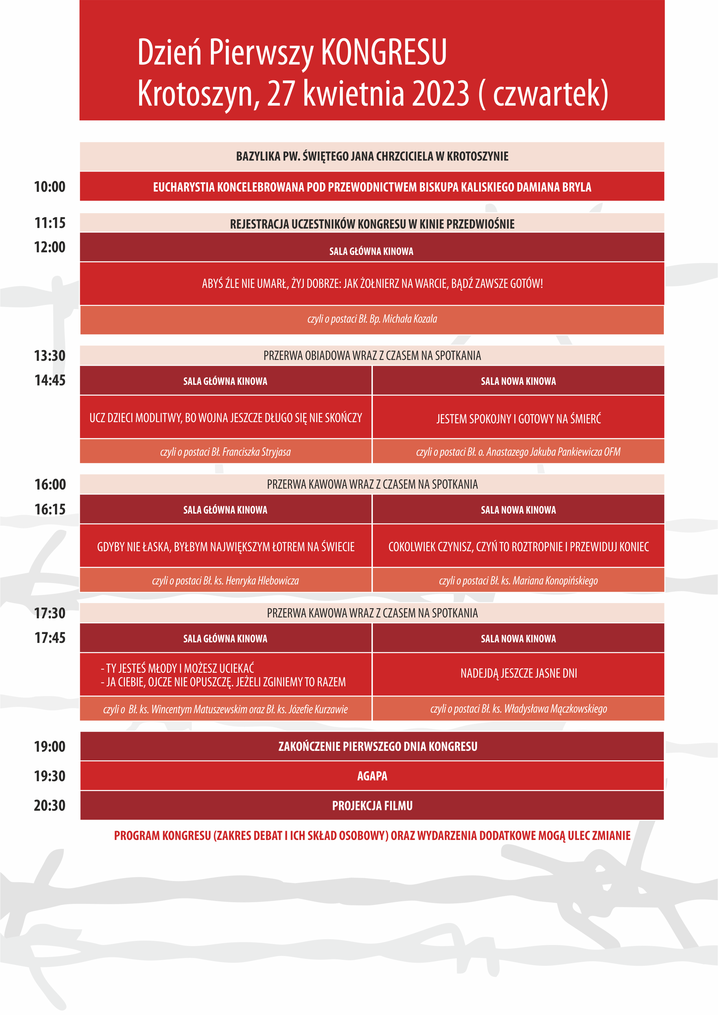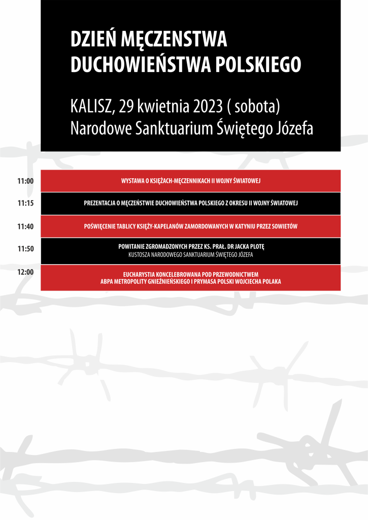 W dniach 27 i 28 kwietnia br. w Krotoszynie i w Kaliszu (Diecezja Kaliska) odbędzie się III. edycja Kongresu 108 Błogosławionych męczenników II Wojny Światowej. Wydarzenie zainauguruje tegoroczne ogólnopolskie obchody Dni Męczeństwa Duchowieństwa Polskiego, które odbędą się w sobotę 29 kwietnia w Narodowym Sanktuarium Świętego Józefa w Kaliszu.