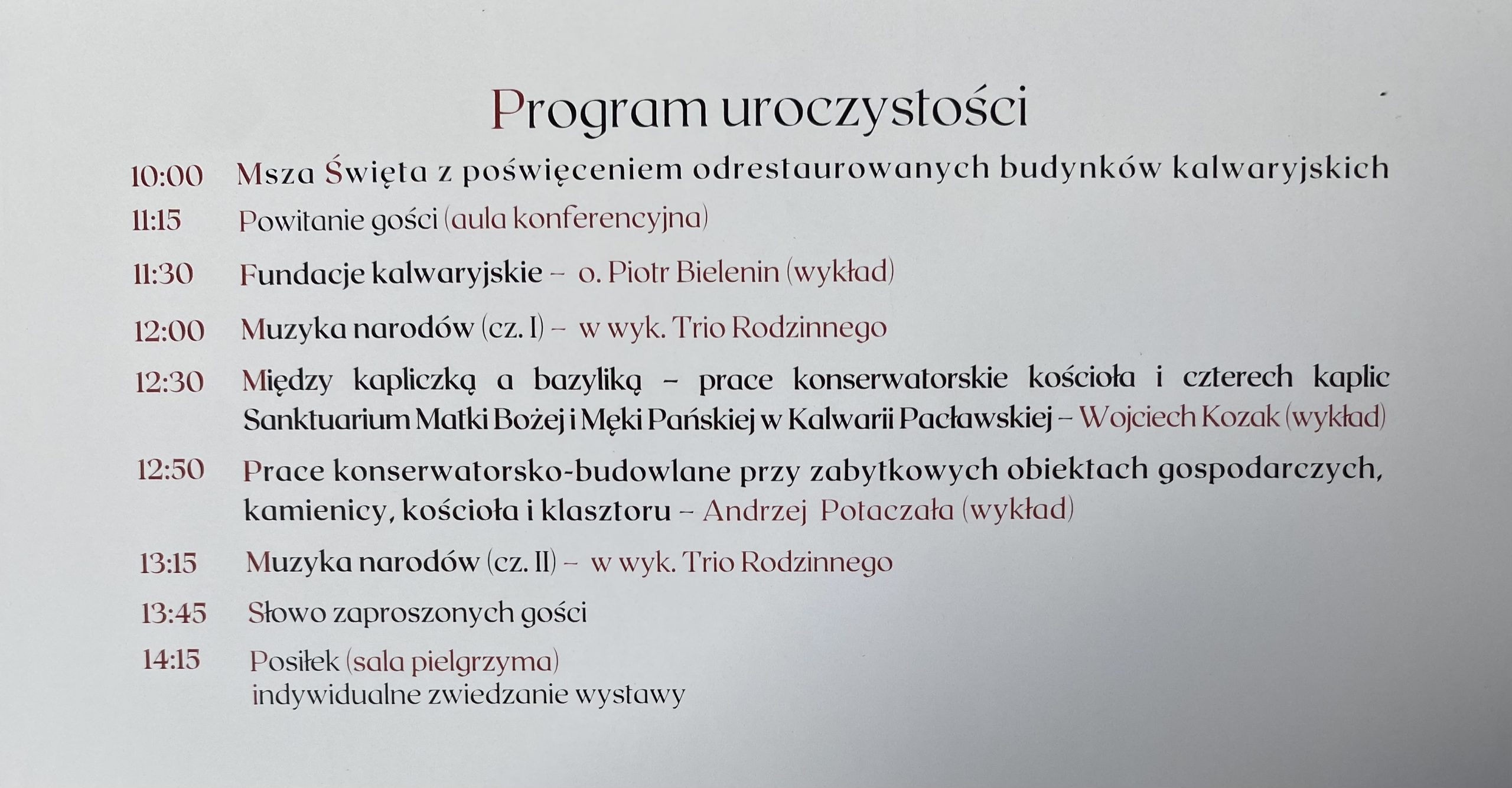 „Miłośnicy sztuki sakralnej i zabytków kalwaryjskich Podkarpacia tego dnia będą mogli obejrzeć odrestaurowane budynki, wysłuchać wykładów i muzyki narodów w wykonaniu Trio Rodzinnego, zwiedzić nową wystawę i uczestniczyć we mszy św. dziękczynnej” – zapewnia kustosz kalwaryjski o. Krzysztof Hura. Początek o godz. 10.00.