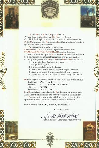 Prośbę zakonników poprał ks. kard. Stanisław Dziwisz, arcybiskup metropolita krakowski oraz przełożony prowincjalny – o. Tadeusz Florek. W tych dniach nadszedł z Rzymu stosowny dokument z 31 października br., stwierdzający nawiązanie tegoż pokrewieństwa, które daje wiernym przybywającym do sanktuarium czerneńskiego możliwość zyskania odpustu zupełnego, przyznanego przez Penitencjarię Apostolską w wiele dni każdego roku: w święto tytularne Bazyliki Matki Bożej Większej (5 sierpnia) i w święto patronalne czerneńskiego kościoła sanktuaryjnego (20 lipca), we wszystkie uroczystości liturgiczne Najświętszej Maryi Panny, raz w roku – w dowolny dzień wybrany przez wiernego oraz ilekroć przybędą do Czernej kierujące się pobożnością grupy pielgrzymkowe.