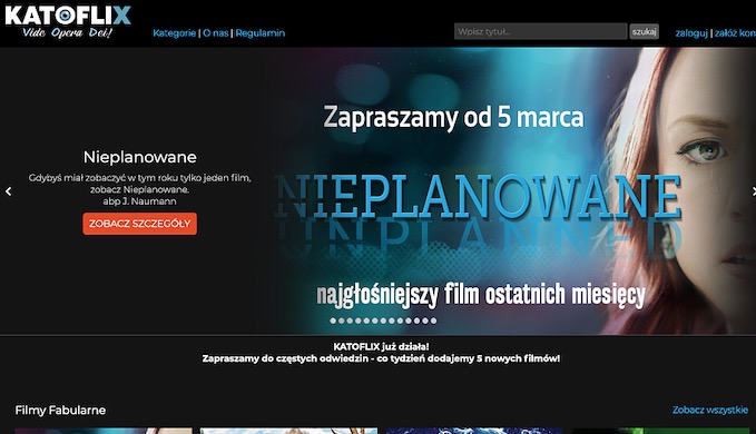 Na chwilę obecną ze stroną katoflix.pl współpracują „Kino Świat”, „Rafael Film”, „SPI”, „Mayfly”, „Kondrat Media”, „Vivarto” czy „Goya Producciones”. Od dziś na platformie można obejrzeć film „Nieplanowane”, jedno z najgłośniejszych dzieł ubiegłego roku, które wraz z pojawieniem się w określonym miejscu, wzbudzało gorące dyskusje i ataki działaczy aborcyjnych wzywających do jego bojkotu.