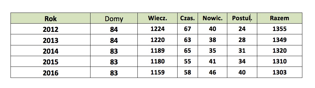 Jak wynika z zestawienia ogólna liczba sióstr powoli, aczkolwiek systematycznie maleje. Zapewne znaczny wpływ na pomniejszenie tej liczby ma ilość zgonów, których w bieżącym roku było aż 21. Starsze siostry, nieraz bardzo już „wiekowe”, odchodzą, ale jednocześnie liczba młodych sióstr podejmujących życie kontemplacyjne, a więc: postulantek, nowicjuszek i profesek czasowych, subtelnie wzrasta. Daje to radość, a przede wszystkim nadzieję, że nadal są dziewczęta, które potrafią podjąć życiową decyzję i pójść za głosem powołania. Decyzja ta nie zawsze jednak odznacza się stałością. Rozkład powołań jest nieproporcjonalny i niezależny od wielkości czy średniej wieku Wspólnoty. Statystyczna mniszka w Polsce w roku 2016 ma 54 lata.