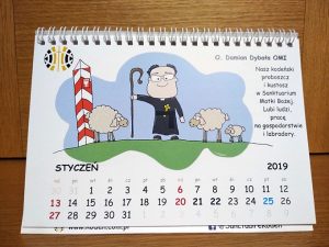 W nasze życie zakonne mocno wpisana jest wspólnotowość, którą przeżywamy wraz z jej cieniami, ale również blaskami. Niekiedy ucząc się dystansu do samego siebie… Komunitet kodeński wydał w tym roku nietypowy kalendarz, w którym każdy z miesięcy opatrzony jest “karykaturą” jednego z domowników. Autorem grafik jest o. Marcin Szwarc OMI. Dzięki inicjatywie odbiorcy mogą poznać każdego z oblatów, którzy tworzą kodeńską wspólnotę. Wkładu pracy niektórych oblatów na co dzień nie widać, ale bez ich posługi, nie byłoby możliwe funkcjonowanie: parafii, sanktuarium Matki Bożej Kodeńskiej, jadłodajni “U oblatów”, domu pielgrzyma, czy klasztoru…