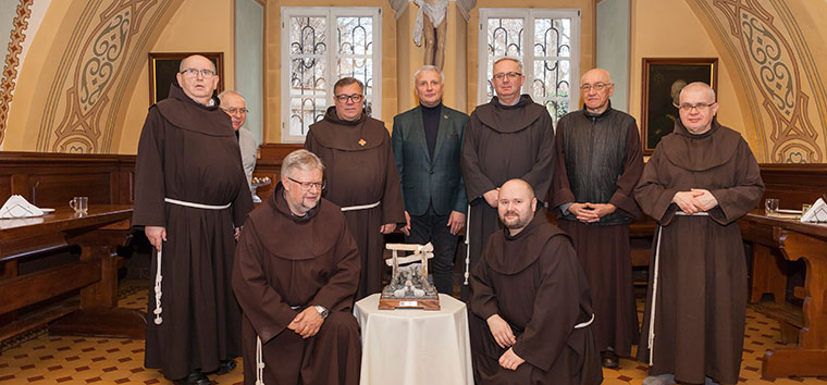 Dnia, 18 grudnia 2025 r. nasza kolekcja szopek bożonarodzeniowych z całego świata wzbogaciła się o kolejny eksponat – właściwie o „klejnot w koronie”. Cudowna szopka z soli! To dar Kopalni Soli „Wieliczka” dla Komisariatu Ziemi Świętej w Krakowie, przekazany na ręce o. Nikodema Gdyka – pomysłodawcy i kuratora wystawy szopek, która będzie otwarta do końca stycznia 2026 r. W klasztornym refektarzu, w obecności miejscowej wspólnoty klasztornej św. Kazimierza Królewicza w Krakowie i naszego Prowincjała o. Krzysztofa Bobaka, unikatowy eksponat przekazał nam Jacek Juszkiewicz – Pełnomocnik Zarządu ds. Informacji Niejawnych Kopalni Soli „Wieliczka” S.A., w imieniu Damiana Koniecznego – Dyrektora Wykonawczego Kopalni Soli w Wieliczce.