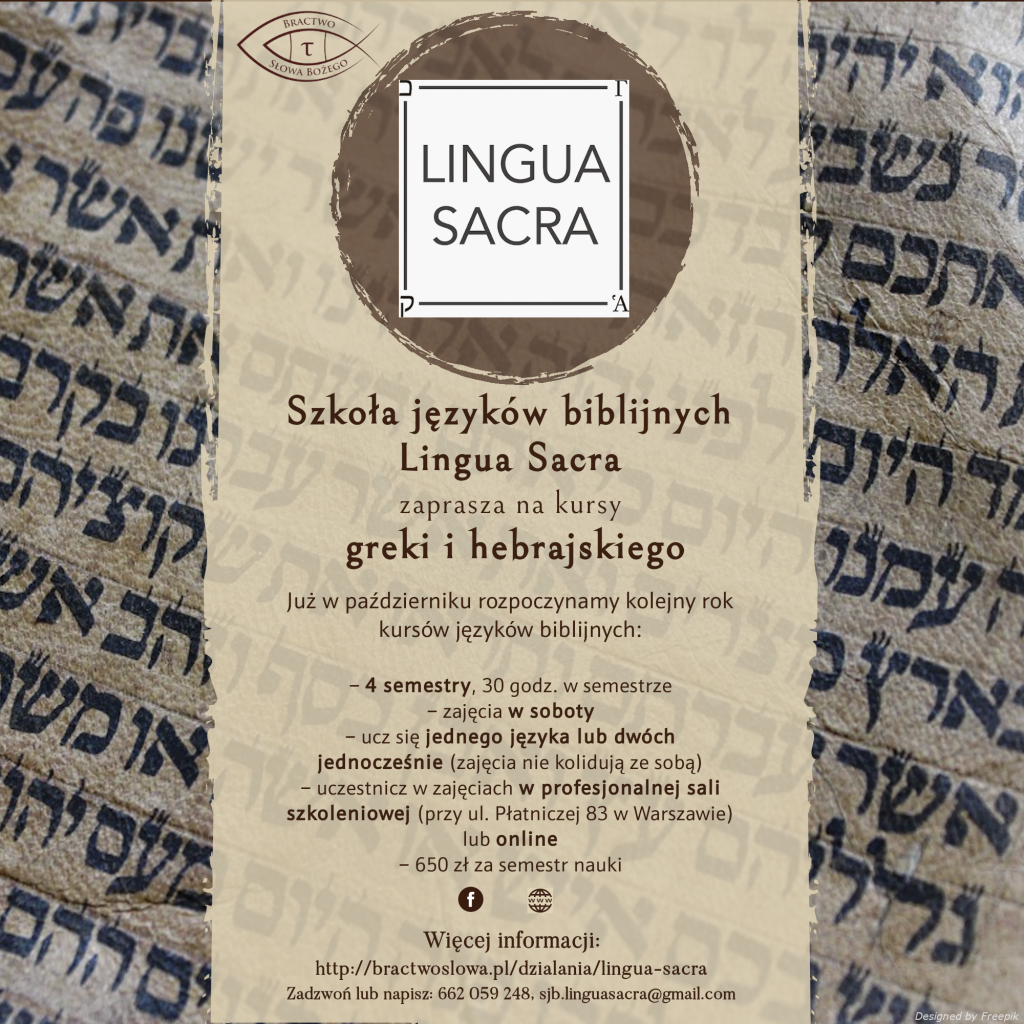 W październiku 2019 r. – odpowiadając na potrzebę i pragnienie słuchaczy Podyplomowych Studiów Formacji Biblijnej na UKSW – Szkoła języków biblijnych Lingua Sacra ruszyła z pierwszymi kursami greki i hebrajskiego. Każdy z kursów trwa 4 semestry i liczy w sumie 120 godz. zajęciowych – tyle, ile jest potrzebne, by rozpocząć przygodę z samodzielnym czytaniem Biblii w oryginale.