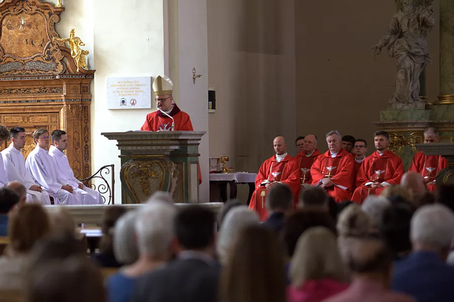 homilii ks. biskup wzywał aby poświęcenie kościoła przynaglało do ciągłego otwierania się na dary Ducha Świętego, przez uczestnictwo w Eucharystii, aby z nowym zapałem apostolskim iść na cały świat i głosić Boga Żywego.