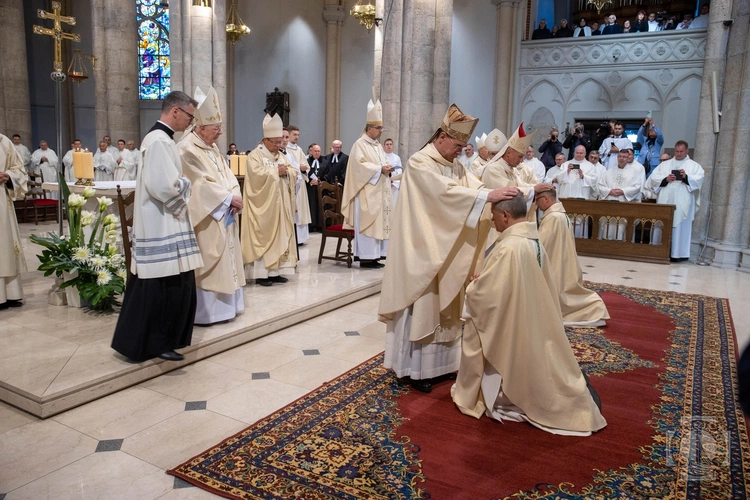 Po homilii rozpoczął się właściwy obrzęd święceń biskupich. Na początku biskupi nominaci złożyli przyrzeczenia, po których położyli się krzyżem i została odśpiewana litania do Wszystkich Świętych. Następnie w ciszy nastąpił obrzęd nałożenia rąk przez konsekratora, współkonsekratorów oraz pozostałych biskupów, po czym kard. Ryś otworzył księgi Pisma Świętego nad głowami kandydatów do święceń i odmówił modlitwę konsekracyjną. Kolejnym elementem święceń biskupich było namaszczeni głów wybranych i przekazanie im księgi Ewangelii oraz insygniów biskupich: pierścienia, mitry i pastorału.
