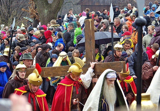 Sceny przedstawiające triumfalny wjazd Chrystusa do Jerozolimy zainscenizowane w Niedzielę Palmową w sanktuarium pasyjno-maryjnym w Kalwarii Zebrzydowskiej zainaugurują Misterium Męki Pańskiej. Rokrocznie uczestniczą w nim dziesiątki tysięcy wiernych.
