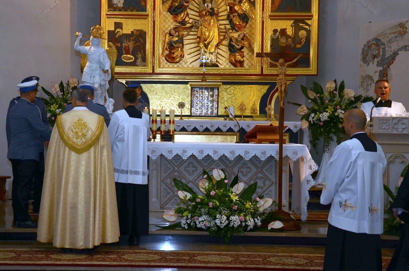W takt melodii ze łzami w oczach patrzyliśmy jak wchodził Wódz Wojska Niebieskiego do naszej świątyni i do naszych serc. Powitany przez dzieci, rodziny i ks. Dziekana Zbigniewa Irzyka w obecności kilku kapłanów z dekanatu, sióstr Michalitek i licznie zgromadzonych wiernych parafian przypomniał Kto jest najważniejszy. Sprawowano liturgię Eucharystii. Orkiestra i przygotowani wcześniej parafianie uwielbiali Boga pieśniami. Przy figurze św. Michała pełnili straż policjanci. Potem modlitwa osobista , koronka uwielbienia Boga ze św. Michałem Archaniołem i chórami Aniołów i Apel Jasnogórski. Czuwanie nocne poprzedziły Godzinki ku czci św. Michała Archanioła.