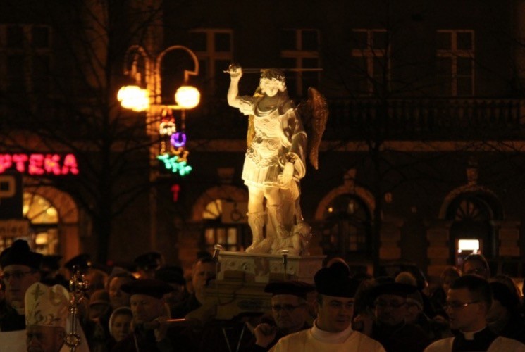 Figurę św. Michała Archanioła z Gargano powitano przy pomniku św. Jana Pawła II, skąd w procesji została uroczyście wniesiona do świątyni, gdzie koronę na głowę świętego nałożył bp Stanisław Napierała.