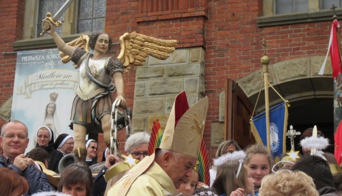 Ostatnia niedziela września jest dniem szczególnej czci oddawanej świętemu Michałowi Archaniołowi – Patronowi Zgromadzeń świętego Michała Archanioła oraz Wspólnot: Rycerzy, Honorowej Straży, Czcicieli oraz wiernych noszących szkaplerz św. Michała Archanioła. Uroczystej mszy świętej odpustowej w Sanktuarium w Miejscu Piastowym o godz. 11.00 przewodniczył ks. bp. Edward Białogłowski z diecezji rzeszowskiej, przy udziale wielu kapłanów i Sióstr zakonnych. Wybór świętego Prawa Bożego oraz podejmowanie przez współczesnych chrześcijan trudnych decyzji w jego swietle, było przewodnim tematem kazania. Ks. biskup zwrócił uwagę na odbywajacy się w Warszawie Narodowy Kongres Trzeźwości oraz spotkanie rodzin na Jasnej Górze. Te dwa wydarzenia mają jeden cel: doprowadzenie człowieka do zawołania św. Michała Archanioła – „Któż jak Bóg!”. Podobnie, jak w poprzednich latach, bardzo uroczystej formy świętowania nadały dzieci, przebrane za aniołów. Po Mszy świętej, śpiewając Koronkę uwielbienia, odnoszącą się do 9 Chórów anielskich, niosąc figurę św. Michała Archanioła w otoczeniu przebranych dzieci, wszyscy wierni uczestniczyli w pięknej procesji. Na koniec uroczystości ks. biskup rozdał dzieciom poświęcone uprzednio aniołki. Niestety, mokry teren nie pozwolił przechodzić do dziewięciu stacji ustawionych pomiędzy drzewami. Trzeba jednak mieć nadzieję, że tak podtrzymywana tradycja, pozwoli kiedyś uroczyście przechodzić do dziewięciu kapliczek Chórów anielskich, połączonych „anielską” drogą. ks. Jan Seremak.