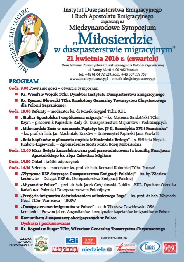 Podczas międzynarodowego sympozjum: „Miłosierdzie w duszpasterstwie migracyjnym”, organizowanym 21 kwietnia br. w Domu Głównym Towarzystwa Chrystusowego w Poznaniu przez Instytut Duszpasterstwa Emigracyjnego pochylamy się nad tematyką troski Kościoła w Polsce o migrujących rodaków i przybywających do naszego kraju cudzoziemców.