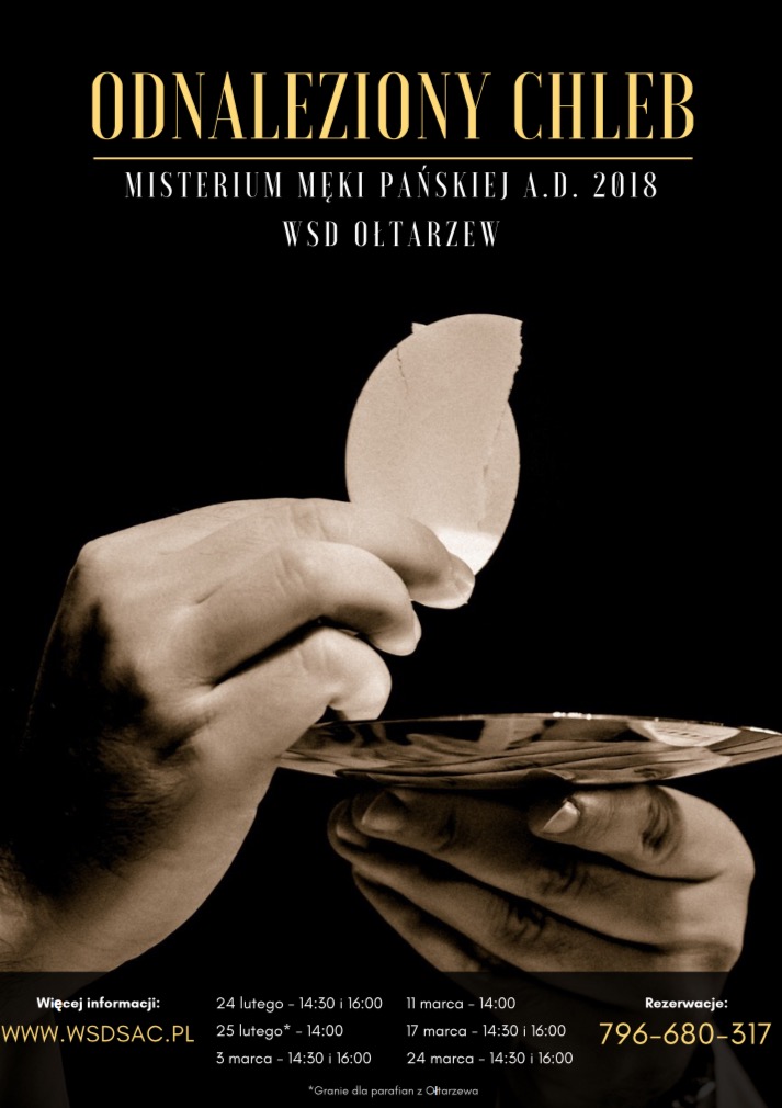 Kolejną kartę historii teatru w Wyższym Seminarium Duchownym Stowarzyszenia Apostolstwa Katolickiego w Ołtarzewie, stanowi Misterium Męki Pańskiej A.D. 2018. Misterium, które nosi tytuł „Odnaleziony Chleb”. Sztuka ta, poprzez ukazanie kilku scen z życia Jezusa i Jego uczniów, chce powiedzieć widzom, że ten sam Jezus jest także blisko nas. On nauczał, karmił głodnych ludzi chlebem, a później został oskarżony, był biczowany i zawisł na krzyżu. Umarł. Lecz po trzech dniach zmartwychwstał i żyje. Jezus jest obecny szczególnie w sakramencie Eucharystii – dlatego jest odnalezionym Chlebem, bowiem nasyca już nie tylko fizycznie, ale przede wszystkim duchowo.