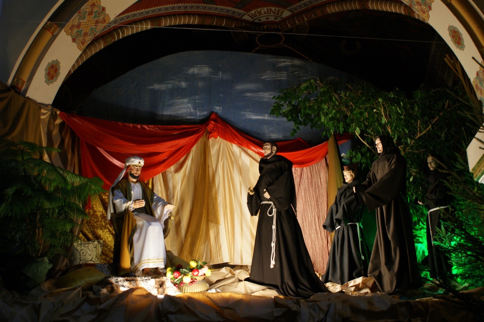 W lewym skrzydle żłóbka przedstawiane są zawsze sceny z życia założyciela zakonu – św. Franciszka z Asyżu. Tym razem przypomniano zdarzenie z 1219 r., kiedy to św. Franciszek wyruszył z krzyżowcami do Egiptu i spotkał się z sułtanem Melek-El-Kamelem, aby go nawrócić. Choć to mu się nie udało, to zyskał uznanie, a nawet przyjaźń sułtana, który dał mu pismo umożliwiające bezpieczne poruszanie się po Ziemi Świętej.