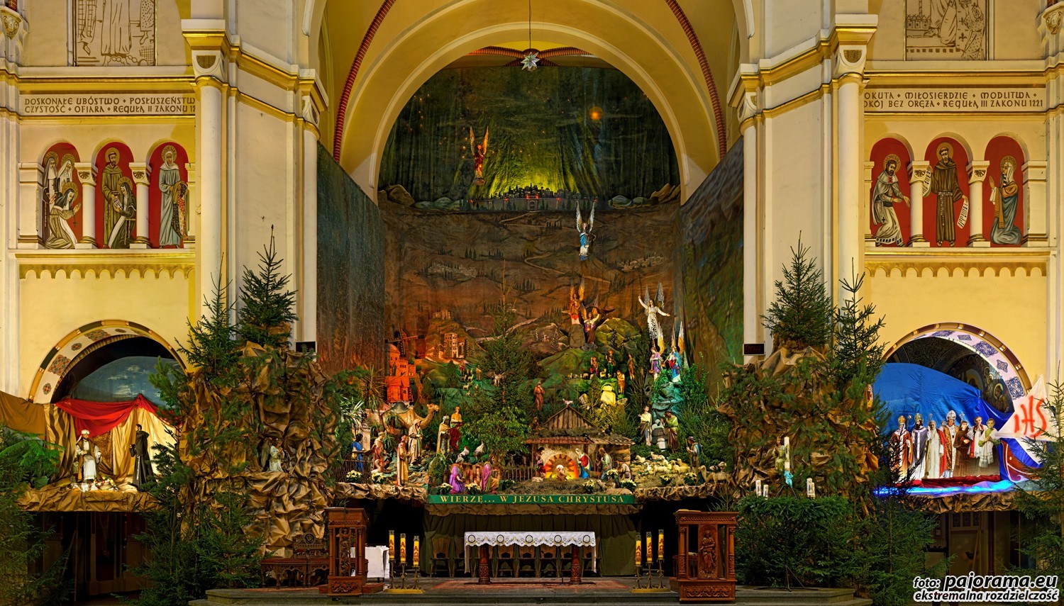 W ołtarzu głównym można podziwiać Świętą Rodzinę z maleńkim Jezusem, natomiast w bocznych nawach co roku pojawiają się nowe akcenty. „W tym roku nawiązujemy do trwającego Roku Wiary słowami +Wierzę w Jezusa Chrystusa+, a w prawym skrzydle przypominamy świętych i błogosławionych, dających świadectwo wiary. To biskupi i męczennicy, święci Roman i Ptolemeusz, których relikwie od blisko 100 lat znajdują się w naszej bazylice” – powiedział PAP proboszcz panewnickiej parafii o. Alan Rusek.