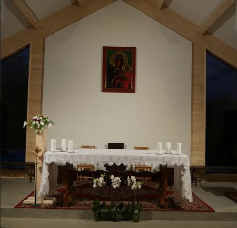 Nad ołtarzem patronuje ikona M.B. Częstochowskiej. Historia tej pięknej kopii jest na tyle ważna, że przywędrowała do naszej kaplicy wraz z jej gospodarzami. W 2008 roku, kiedy Misjonarze M.B. Pocieszenia zakończyli pierwsze swoje rekolekcje na Jasnej Górze, ówczesny jej Przeor O.Roman Majewski, poznając nowe Zgromadzenie na polskim gruncie, postanowił obdarować je, tą właśnie ikoną. Nowa kaplica wydaje się być miejscem, na które czekał ten obraz.
