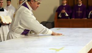 O godzinie 13.00 w kościele przyklasztornym rozpoczęła się Eucharystia pod przewodnictwem biskupa Zbigniewa Zielińskiego, podczas której dokonał ponownej konsekracji świątyni. W kazaniu przypomniał burzliwą historię kościoła, wspominając legendarną postać o. Józefa Mańkowskiego OMI. Podkreślił jednocześnie, że to 71. rocznica obecności “dobrych oblatów” przy kościele św. Józefa w Gdańsku. Kaznodzieja wyraził wdzięczność Kościoła Gdańskiego za gorliwą duszpasterską posługę misjonarzy, wyrażającą się przede wszystkim poprzez stały konfesjonał oraz straż przy Najświętszym Sakramencie:
