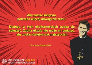 Im dłużej jestem zakonnikiem, tym częściej łapię się na tym, że obieram utarte szlaki… sprawdzone sposoby… na szczęście dość często zdarzają się momenty, że staram się odkrywać na modlitwie nowe ścieżki ewangelizacji. Jednym z takich momentów było zetknięcie się z moim starszym współbratem, o. Mario Borzaga OMI. Nie tylko starszym w sensie chronologii życia, ale też ogłoszonym przez Kościół błogosławionym. Dzięki niemu sięgnąłem po moje notatki medytacyjne z nowicjatu, z czasów seminaryjnych, luźne kartki poprzypinane na tablicy korkowej, powtykane między karty Pisma Świętego oraz książeczki Konstytucji i Reguł. To był powiew wiosny… Zaproszenie do kolejnego-pierwszego kroku…
