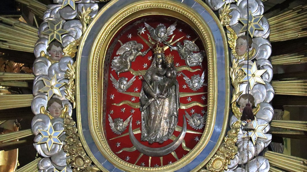 Kalwaryjska bazylika nosi wezwanie Matki Bożej Anielskiej. W głównym ołtarzu została umieszczona srebrna figura Maryi w otoczeniu aniołów, którą zakupił w Loreto we Włoszech w 1590 roku biskup Bernard Maciejowski, a poświęcił papież Sykstus V. Figurę przekazał bernardynom Mikołaj Zebrzydowski, fundator sanktuarium. 4 października 1609 roku biskup krakowski Piotr Tylicki w asyście biskupów: łuckiego Pawła Wołuckiego i pomocniczego krakowskiego Pawła Dębskiego, uroczyście konsekrował kościół.