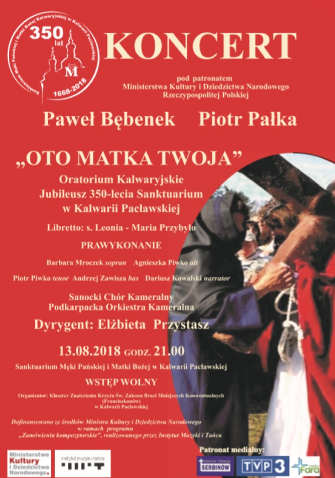 13 sierpnia o godz. 21.00 w Kalwarii Pacławskiej k. Przemyśla zostanie wystawione oratorium „Oto Matka Twoja”. Dzieło krakowskich kompozytorów Piotra Pałki i Pawła Bębenka pod dyrekcją Elżbiety Przystasz będzie można obejrzeć na żywo w TVP3. Okazją jest obchodzony w tym czasie jubileusz 350-lecia Sanktuarium Męki Pańskiej i Matki Bożej – najważniejszego miejsca pielgrzymkowego Podkarpacia.