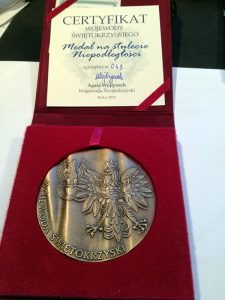 Sanktuarium Relikwii Drzewa Krzyża Świętego na Świętym Krzyżu zostało uhonorowane przez Wojewodę Świętokrzyskiego – “Medalem na Stulecie Niepodległości”. Uroczystość odbyła się w urzędzie wojewódzkim w Kielcach w czwartek 15 listopada br. Przekazując odznaczenie na ręce superiora klasztoru, o. Mariana Puchały OMI, wojewoda Agata Wojtyszek w dedykacji napisała: