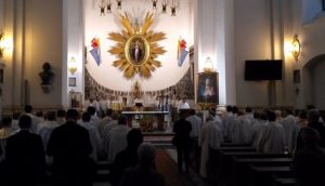 Mszy św. o godz. 15.00 w sanktuarium maryjnym, na której zgromadzili się przedstawiciele męskich wspólnot zakonnych na terenie archidiecezji, przewodniczył i homilię wygłosił abp Metropolita Warszawski ks. kard. Kazimierz Nycz. W homilii kardynał zachęcił, aby ciągle reflektować nad charyzmatami zakonnymi i nad ich realizacją w zmieniających się czasach. Światu ciągle potrzeba świadectwa życia według rad ewangelicznych. Kardynał zaznaczył również, że to spotkanie z zakonnikami diecezji jest okazją do wyrażenia wdzięczności za ubogacającą obecność charyzmatów zakonnych w Kościele diecezjalnym.