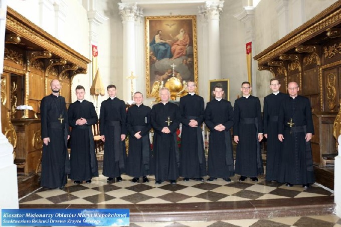 Po homilii nastąpił obrzęd pierwszej profesji zakonnej nowicjuszy Oblackich. 7 młodzieńców złożyło dziś śluby zakonne: czystości, ubóstwa i posłuszeństwa na jeden rok. Otrzymali strój zakonny – sutannę oraz Konstytucje i Reguły Zgromadzenia Misjonarzy Oblatów Maryi Niepokalanej. Przez ostatni tydzień przygotowywali się do tej chwili poprzez rekolekcje, które prowadził o. dr Łukasz Krauze OMI, wykładowca homiletyki z oblackiego seminarium w Obrze.