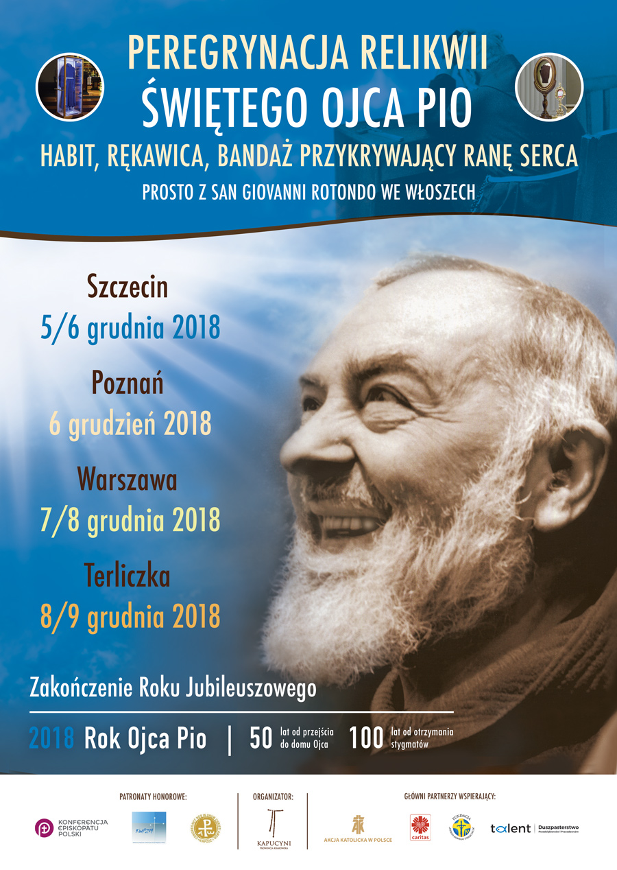 Jednym z takich wydarzeń jest pielgrzymka wyjątkowych relikwii świętego Stygmatyka: habitu, rękawiczki, którą okrywał stygmat dłoni oraz chusty osłaniającej niegdyś krwawiący bok. Cudowne relikwie odwiedzą Szczecin, Poznań, Warszawę i Terliczkę (k. Rzeszowa). Peregrynacja znaków życia i świętości świętego Ojca Pio dokona się w dniach 5-9 grudnia 2018 roku.