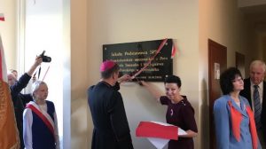 Po wygłoszonym przez biskupa słowie, nastąpił uroczysty akt nadania imienia szkole. Placówka otrzymała imię franciszkańskich Męczenników z Peru – bł. Michała Tomaszka i bł. Zbigniewa Strzałkowskiego. Ważną częścią wydarzenia było poświęcenie i przekazanie sztandaru, będącego symbolem wartości dla których chce żyć społeczność szkoły – nauki, pracy, służbie Bogu, Ojczyźnie i drugiemu człowiekowi, Sztandar został wykonany na cześć nowo wybranych patronów szkoły i widnieje na nim wizerunek Męczenników z Pariacoto.