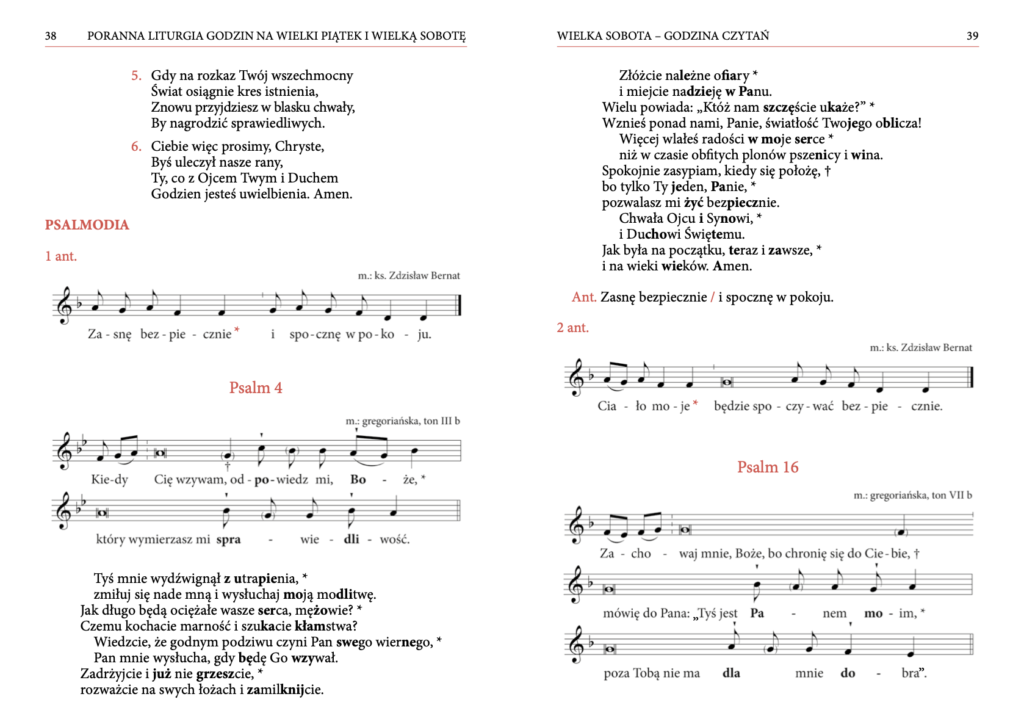 W publikacji zawarto muzyczne opracowanie tekstów Godziny czytań i Jutrzni dwóch dni Triduum Paschalnego. Do psalmów zastosowano tradycyjne melodie tonów gregoriańskich z ich różnymi, często mniej znanymi formułami kadencyjnymi (tzw. dyferencjami). Jedynie do kantyku ewangelicznego Benedictus, dla podkreślenia rangi tego tekstu, zaproponowano opracowanie wielogłosowe. W zapisie nutowym melodii do psalmów i kantyków zaznaczono akcenty słowno-muzyczne oraz nuty dodane w miejscach, gdzie tekst wymagał uzgodnienia akcentuacji słownej z muzyczną. Dla poprawnego wykonania psalmów kursywą zapisano sylaby przygotowawcze, a sylaby akcentowane wytłuszczono.